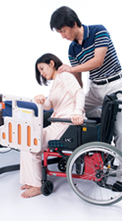 左腰部を支え、左腕側へ寄りかかるように体を傾かせ、右臀部を軽く押し、車いすへ移乗させる。移動中に車いすが動かないように左足で固定する。
